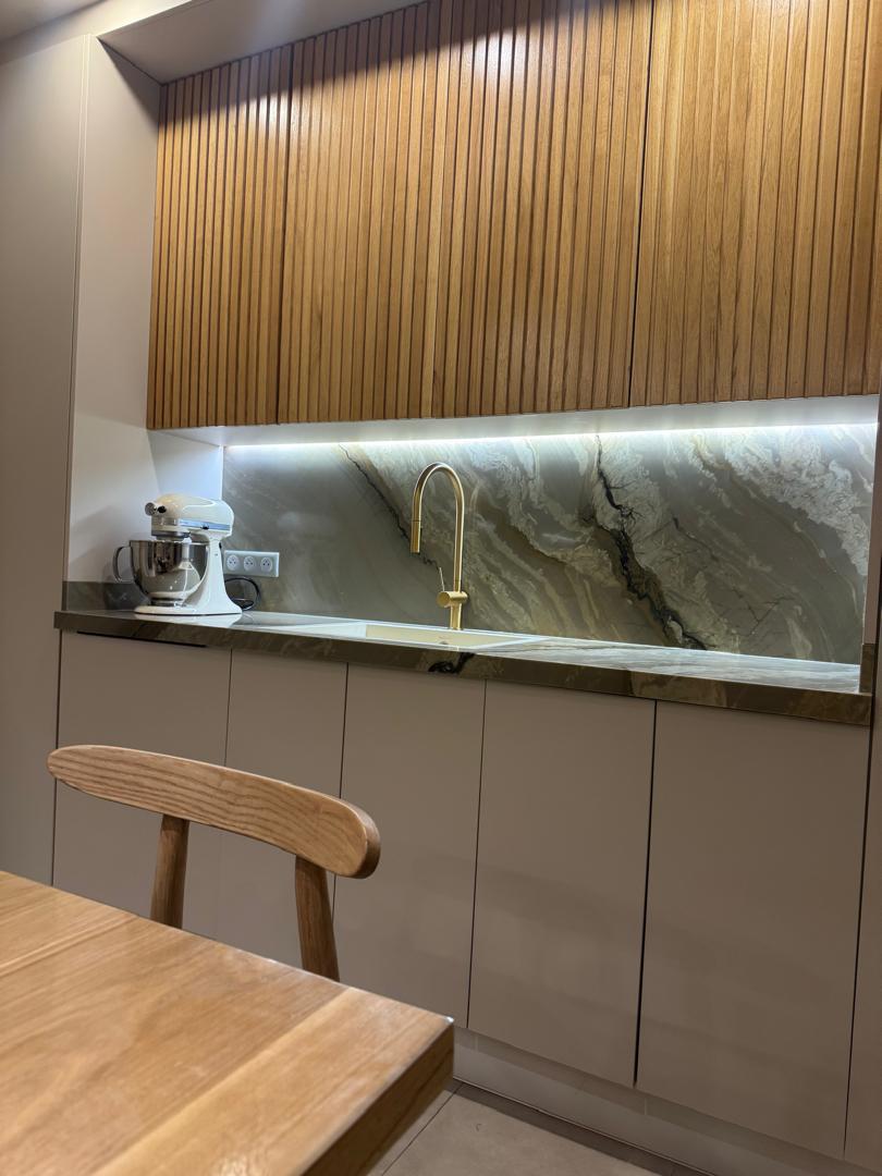 Cuisine moderne avec plan de travail en marbre et chaise en bois