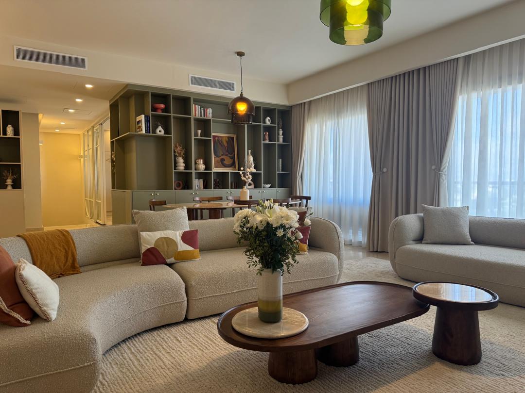 Séjour moderne avec canapés, table basse, fleurs, luminaires, bibliothèque, rideaux.