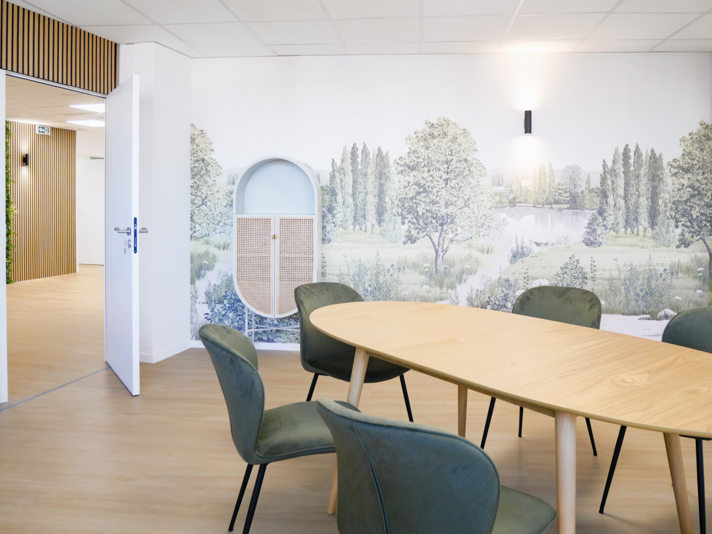 Salle de réunion dans des bureaux professionnels rénovés à Toulouse, décorée d'une fresque murale représentant un paysage naturel avec des arbres et un lac.